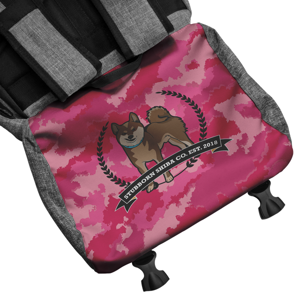 The Stubborn Shiba Pink Camo Back Pack will tote all your gear whether you’re hitting the trails, commuting to work, or heading to the airport for your next trip. With a dedicated laptop and tablet sleeve, secret stash pouches, RFID-lined pocket, and constructed from durable, water-repellent snow fabric, this pack has got you covered in any situation! Bring along your jacket, blanket, yoga mat or even skateboard with the front strap buckles. A luggage pass-through handle, ergonomic back panel with memory foam, adjustable padded shoulder straps and sternum strap makes carrying this bag a walk in the park.